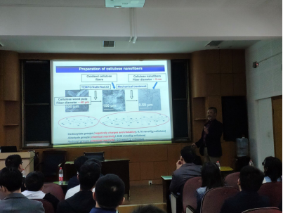 师生的学术交流,美国石溪大学的Benjamin S. Hsiao教授在我校王宗宝教授的邀请下,于2019年11月18日下午,在材化学院210会议室作了“Nanocellulose Technologies for water purification(纳米纤维素的水纯化技术)”学术报告。Benjamin S. Hsiao教授针对目前水处理方法的低效、价格昂贵等弊端,开发出一种天然纤维素的氧化处理的方法,所制备的纳米纤维素具有较高的比表面积,对污染水中的重金属具有高效的吸附能力。此方法具有制备过程简单便捷、能耗较低和环保等优点,而且制备纳米纤维素所采用的原料为农作物废弃物,如秸秆和高粱杆等,是真正意义上的变废为宝,因此具有很高的应用价值。Benjamin S. Hsiao教授全面解析了纳米纤维素的制备及其应用研究,深入浅出,引起了与会听众极大的兴趣,丰富了大家对纤维素方面理论知识。材化学院李砚硕、王宗宝、张利、苗伟俊、李奕国和逯鹏等40位师生认真听取了学术报告,并在会后进行了交流讨论。