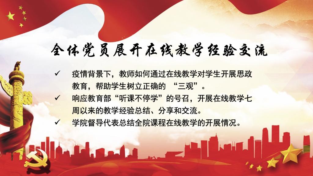 学院相关负责人总结指出,教师要将思政教育贯穿教学过程,落实教书育人的职责,同时希望全体教师要群策群力用各种方式不断探索、优化在线教学模式,稳步提高教学效果和质量。