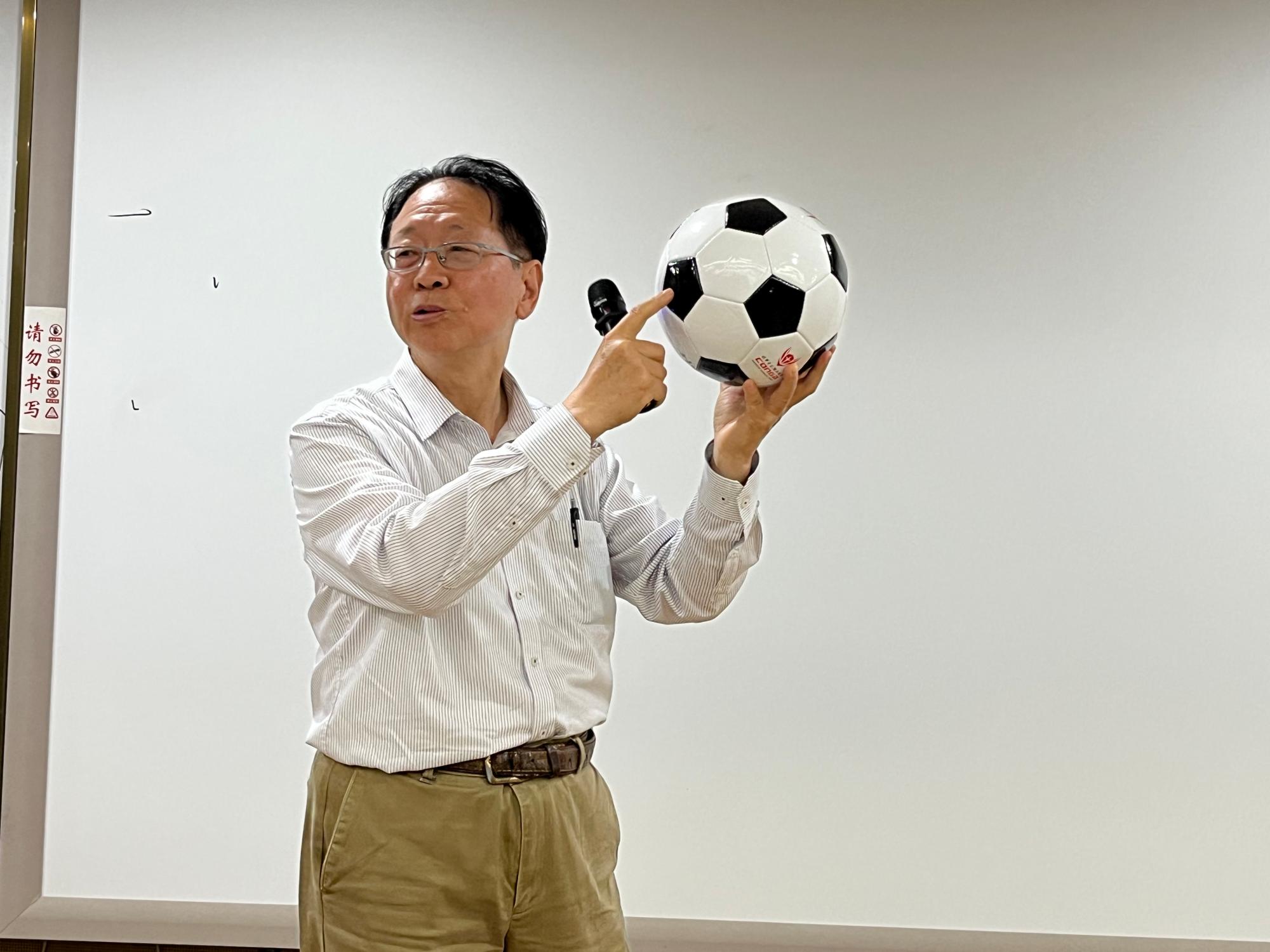 郑院士师从著名化学家、1996年诺贝尔化学奖获得者斯莫利(R.E.Smalley)教授,长期从事原子团簇科学研究。他从基础理论切入,结合留学科研时的经历,深入浅出地为91视频师生们解释了原子团簇的相关问题,阐述了纳米材料与原子团簇的区别。随后,郑院士用足球做教具,生动形象地讲解了C60的结构和原子团簇研究进展,展望了学科发展的前景。