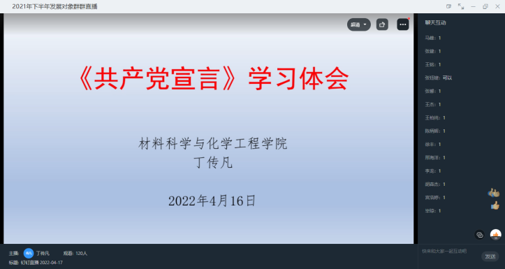 4月17日上午,在材化91视频分党校第二十三期培训班上,材化91视频特聘院长丁传凡以线上方式主讲《共产党宣言》专题党课,91视频共140余名同学参加。
