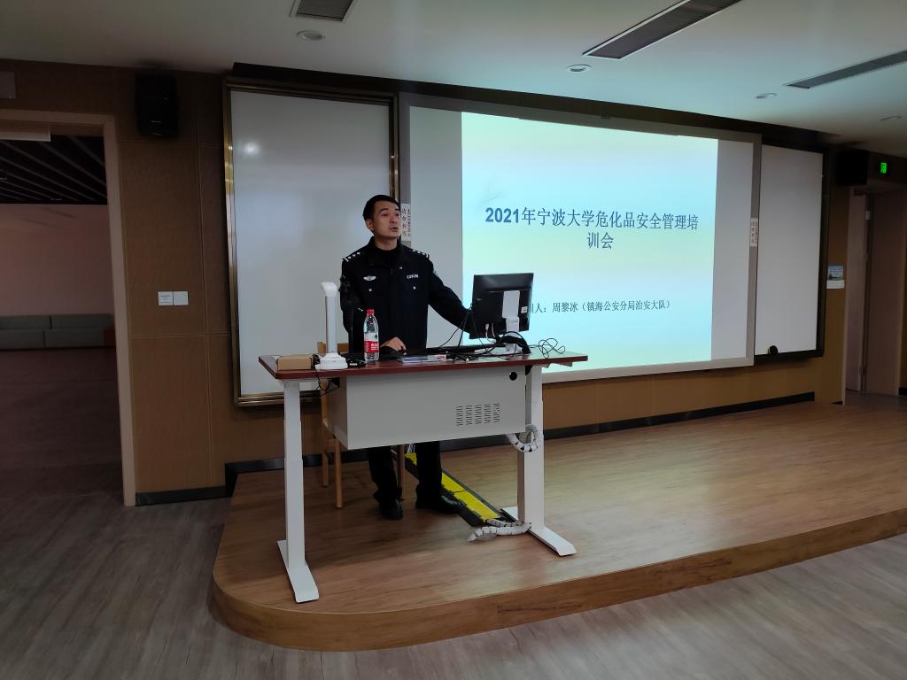 为了进一步提高实验室安全管理,切实增强实验室安全责任意识和事故应急处置能力,营造良好的实验室安全氛围。11月22日中午,由资产与实验室管理处主办,材化91视频承办的实验室安全工作管理专题讲座在宁波大学北区2号教学楼306室顺利举行。本次活动特别邀请了宁波市公安局镇海分局治安大队周黎冰警官和江北区消防救援大队刘慧明副大队长分别就危险化学品安全管理和消防安全做了精彩的讲座。本次讲座采用线下和线上直播相结合的方式,现场到会人数约150人,除了材化91视频全体教师外,还有我校各91视频和研究院的实验中心主任、安全员和危险化学品管理员;同时,材化91视频的研究生和本科生共831人通过钉钉线上参与到本次讲座。