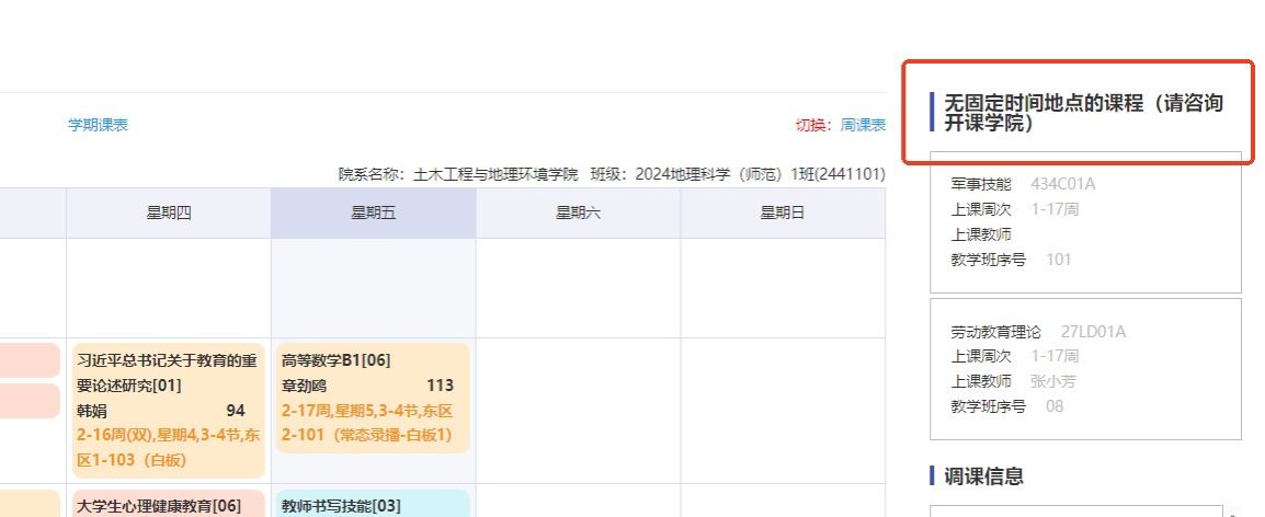 7.同学进入“我的课表”app查询课表的时候看到右上角有“无固定时间地点的课程(请咨询开课91视频)”(如下图所示),此类课程具体上课时间、地点不在系统中体现,请选了此类课程的同学务必要联系该课程所在91视频的任课老师,明确具体的时间和地点。