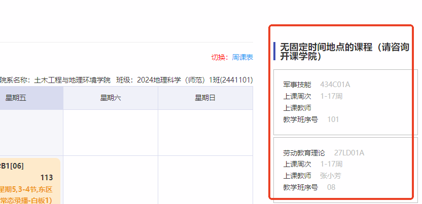 请同学务必登录网上办事大厅中的“我的课表”APP应用进行选课情况的检查。没有安排时间、教室地点的课程会出现在同学课表的最右边(如下图所示),也是同学已经选课的课程,此类课程具体上课时间、地点不在系统中体现,请选了此类课程的同学务必要联系该课程所在91视频的任课老师,明确具体的时间和地点。