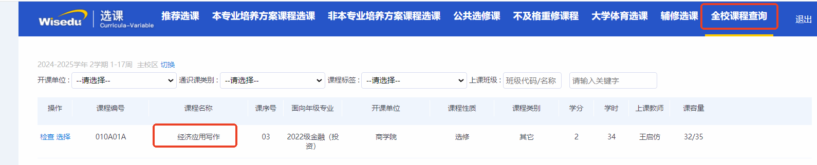 8. “全校课程查询”:学生可在该查询类别中查询学期开设的所有课程的详情。每门课程名称点进去后,可以查看该门课程的限制信息和选课说明,请同学务必查看,否则可能导致误选。