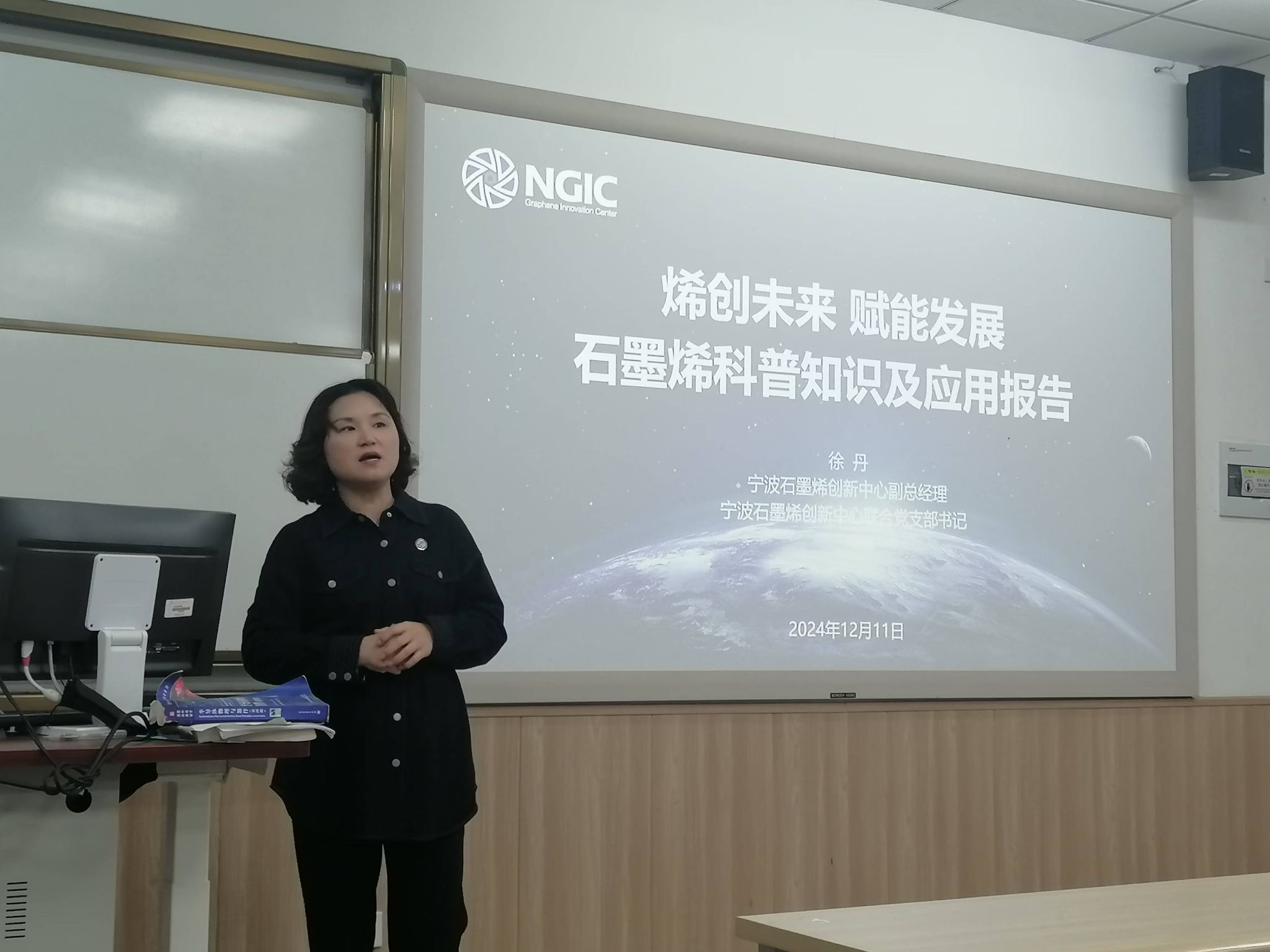 12月11日,宁波石墨烯创新中心有限公司的副总经理徐丹女士受邀来到我院,为2022级材料专业的学生们带来了一场精彩纷呈、关于石墨烯科普知识及其应用的专题报告,报告在北校区2-210教室举行。徐丹女士深入浅出地向学生们介绍了石墨烯这一神奇材料的发现历程、基本特性、制备方法以及其在各个领域中的广泛应用前景。石墨烯,作为目前发现的最薄、最坚硬、导电导热性能最好的一种新型纳米材料,被誉为“黑金”,并享有“新材料之王”的美誉。其独特的二维结构和卓越的物理化学性能,使得石墨烯在电子、信息、新能源、航空航天等多个领域都具有巨大的应用潜力。
