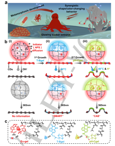 论文以热引发剂和光引发剂作为生长因子的类似物从基础水凝胶中扩散出来引发聚合生长出新的结构,建立了一种通用的仿生由内向外生长技术,并构建了类生物结构编辑能力的荧光水凝胶驱动器。通过编辑不同驱动单元的生长排列位置可以实现响应性的3D折纸类形状变化,这种可编辑性使得通过预先设计的生长排列来预测形状变化成为可能。通过在结构编辑水凝胶上以碳点为墨水书写特定的信息,利用不同环境钥匙(如,温度、pH等)得到的差异化驱动状态可用于可视化信息的传递。