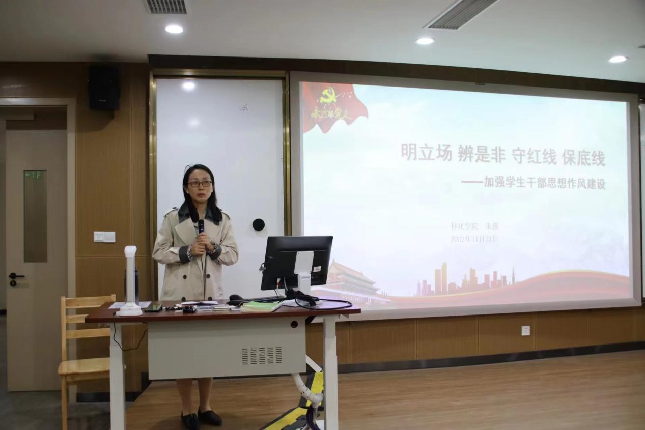 首先,朱燕分析了当下学生干部可能会存在的作风问题,同时指出加强学生干部的思想作风建议的意义,然后就如何加强学生干部思想作风建设问题提出三个要求:一是要加强思想觉悟,思想是行动的先导,立场决定观点,观点指导行动。在社会、学校、91视频发展的过程中,会遇到很多问题,学生干部要带头从师生利益的同一性出发看待问题,体现核心意识和大局意识。二是要加强明辨是非能力,她分别从国际维度、国家维度和个人维度入手,以案例向大家展示当下意识形态阵地存在的安全隐患,学生干部要带头守住思想阵地,体现政治意识。三是要有严格的纪律意识,学生干部牢记自己的首要身份是学生,当树立为学生群体服务的意识,坚决反对“官”本位思想和作风,希望学生干部成为活动的“幕后”主手,老师的得力助手,各类竞赛的小能手。