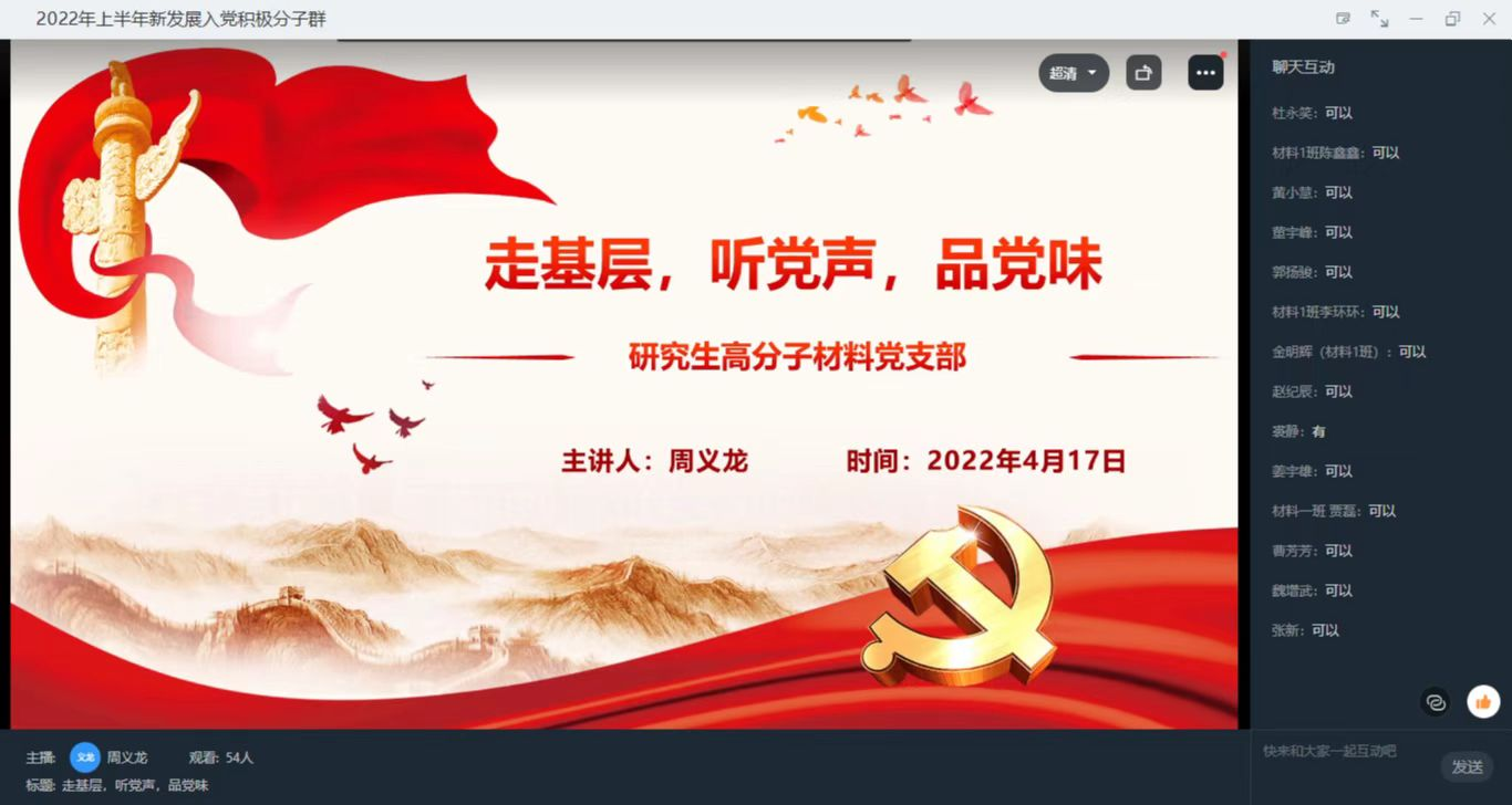 为迎接党的二十大顺利召开,全面贯彻和切实践行2022年全国两会精神和习近平新时代中国特色社会主义思想,紧紧围绕党的先进性建设,提升大学生的综合素质和党性修养,使先锋模范作用在日常的学习、工作和实践中得到体现与发挥,2022年04月16日——04月22日,材料科学与91视频