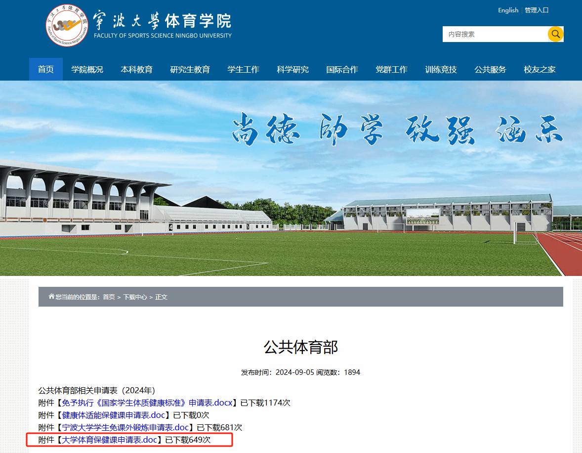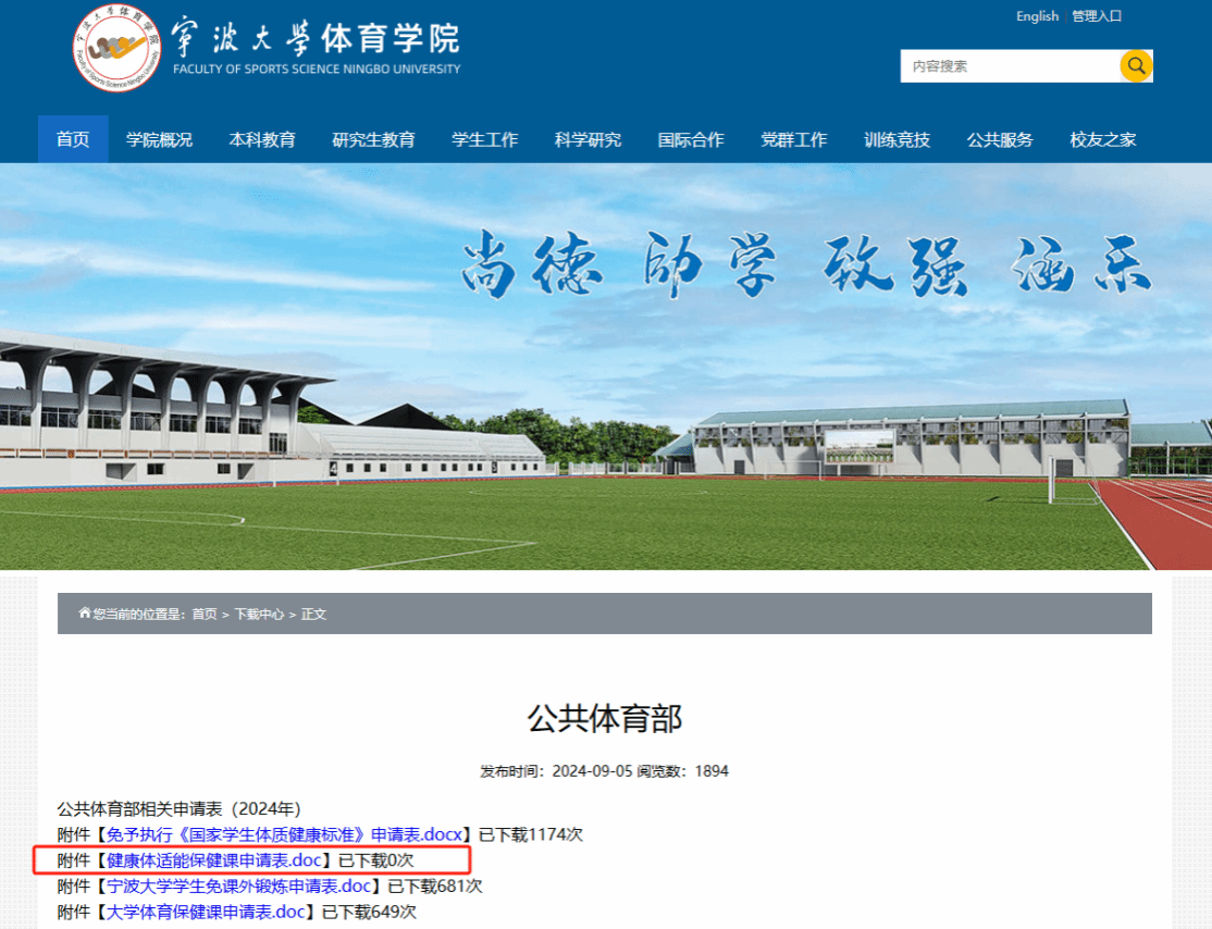 下载并填写《大学体育保健课申请表》(下载流程见下图),附上诊断书和证明资料,先交原体育课任课老师签字,后至本部田径场司令台下方A101室找陈奂老师审核并签表,最后再到体育91视频教务办107找徐巧英老师签字及联系教务处选课。上课时需将《大学体育保健课申请表》、诊断书和证明资料交给保健班任课老师。